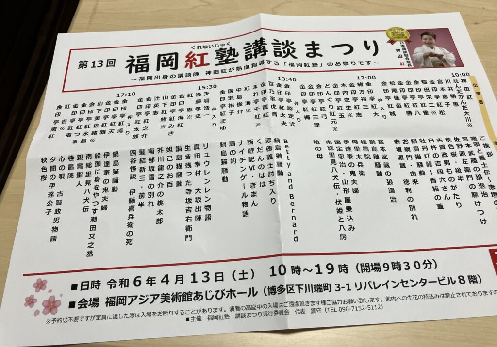 福岡紅塾講談まつり🍀 一般 Twitter Facebook はてブ Pocket LINE コピー 2024.04.13 知り合いの先生が出演されたので、観に(聴きに)行って来ました。どなたも感情豊かで、素晴らしく、情景がハッキリと浮かんで来るようでした♡楽しかったです🤗